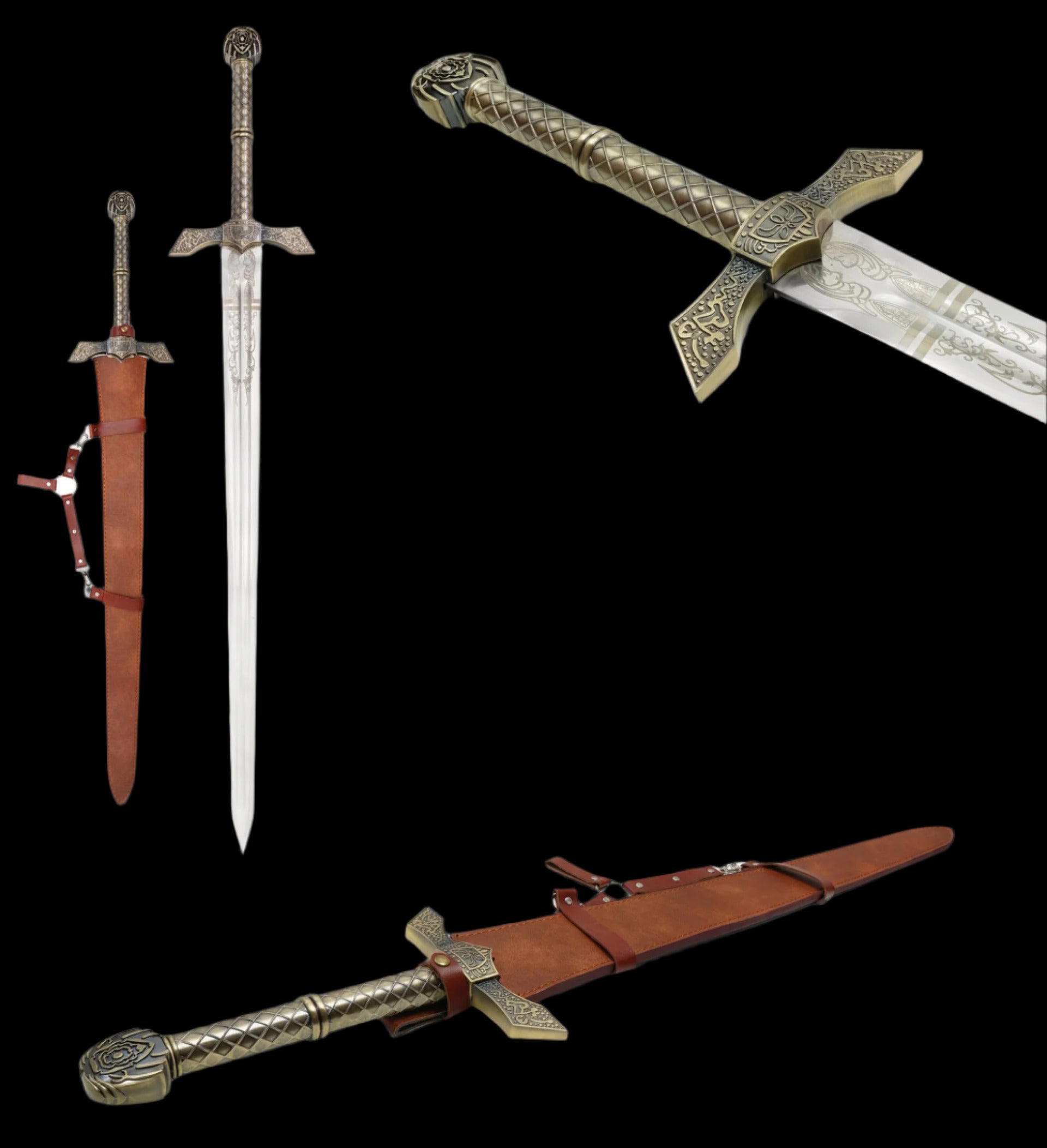 Ornate Metal Handle: Crafted for display and handling, the handle’s detailed engravings add a layer of authenticity and artistry, evoking the power of fallen knights.