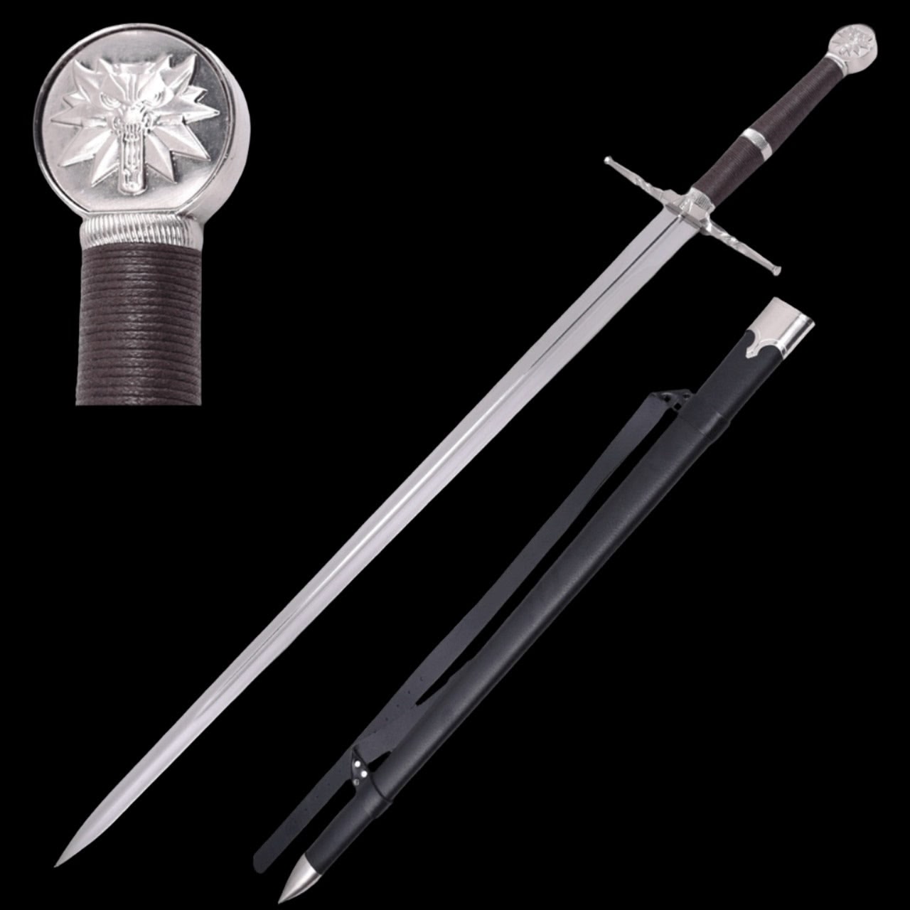 The steel sword measures approximately 47 to 49 inches, capturing the iconic longsword size Geralt wields in the game.